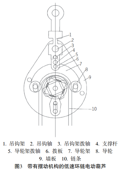 摆动机构包括导轮架和导轮。导轮架为对称结构,导轮架和吊钩架之间设有转动连接结构,转动接结构的连接处位于导轮架的对称轴上,导轮转动连接于导轮架对称的两端。墙板设有弧形导槽,导槽与导轮的轴配合形成限位结构,导轮的滑动连接于所述墙板上。转动连接结构包括拨板、支撑杆和拨轴,拨板的两端通过拨轴转动连接于吊钩架和导轮架。墙板设有限位柱,导轮架上设有缺口,限位柱和缺口配合,缺口为弧形,缺口的长度小于等于所述导槽的长度。
